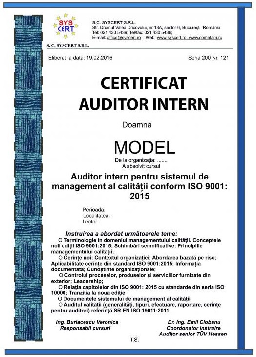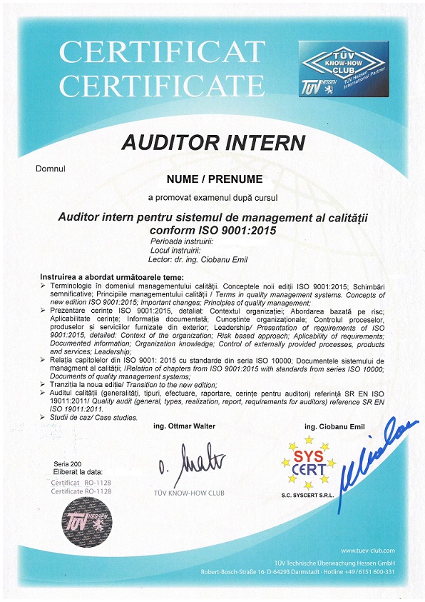 Poti vizualiza modelele de certificate Auditor intern SYSCERT si Auditor intern TUV Know How